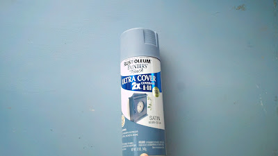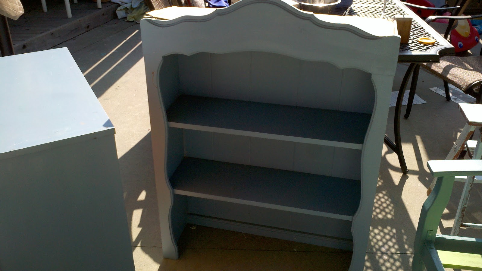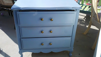 The existing paint was in overall good shape, just needed some touching up. I just so happened to have a left over can of slate blue spray paint that would help clean this piece up nicely. So one quick coat gave it a fresh, clean look. I sanded the entire piece with super fine (220) sand paper to bring some of the original blue out and soften the spray paint look, making it look more like it was brush painted (Typically, I only use spray paint on detailed chairs that would be impossible to brush paint because it covers the wood grain and takes away a lot of the charm of painted furniture).