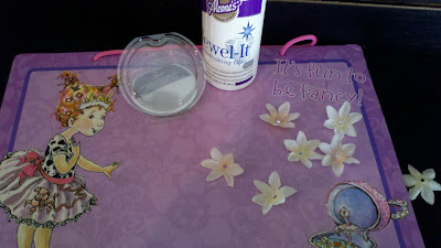 Fake flowers and left over swarovski rhinestones from my sisters wedding (I bejeweled my girls flower girl dresses for her wedding by hand! Each embroidered flower had a small crystal in the center that caught the light.)