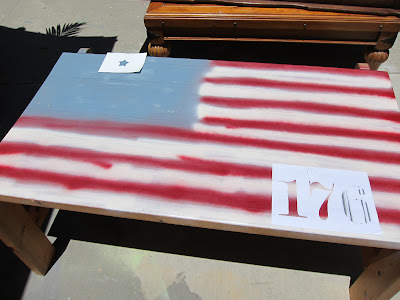 I’ve had it for a few weeks and it hasn’t sold in “as is” condition. In terms of prepping it for the store…just not quite the right style. But, today as I was driving around town and looking at all of the American flags on cars, buildings and business, I was completely inspired. This table had to be an American flag. Not just any flag, though…the original colonial flag (That’s only because there was no way in heck I was going to paint 50 stars).
