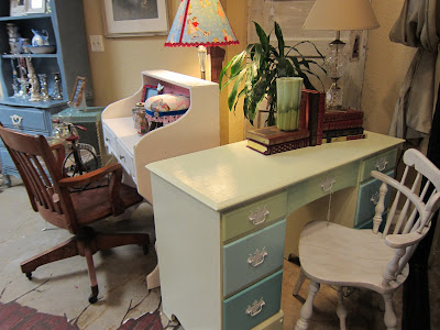 The window display featuring my new desks. Note the early American two-drawer desk behind the awesome multi-colored one! The white one with pink accents is a reasonable $115. The multi-colored desk is priced at $275.