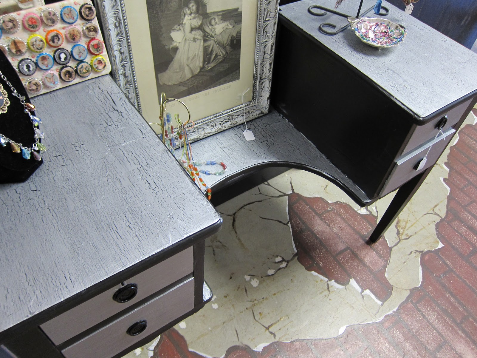 Metallic Silver drawers and vanity top. More Crackel.