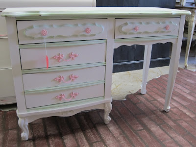 This adorable desk (which was given to me) was selected from my stock of unfinished pieces to be completed as a custom project. The only instructions were to put green and pink everywhere. I opted for more subtlety with this one and added splashes of green on the top to peek through the white, put green on the trim and pink hardware. I hope they like how it came out. I could’ve sold it multiple times in the day that it was hanging out in the store.