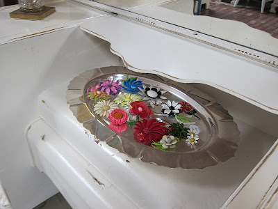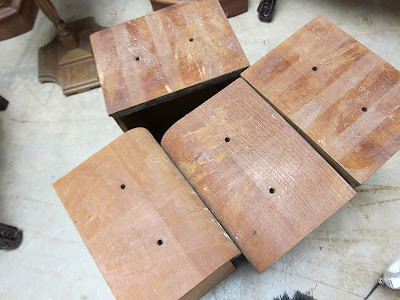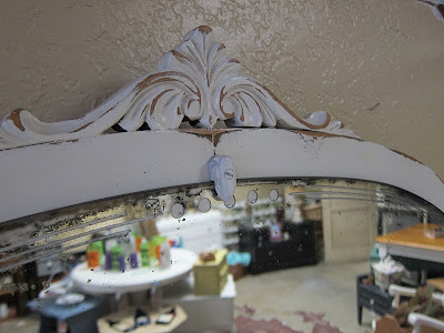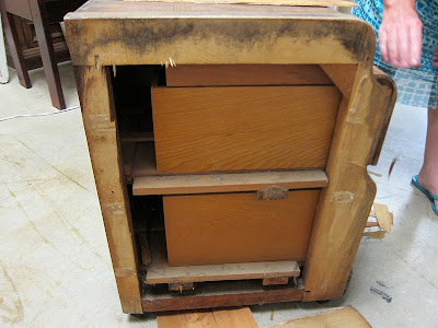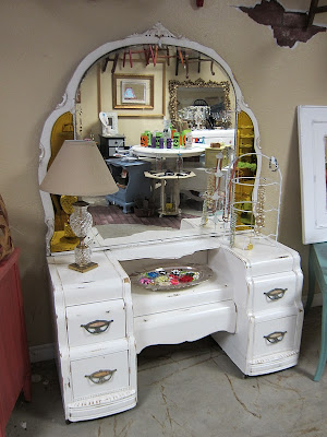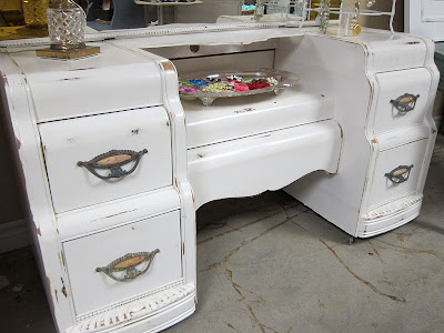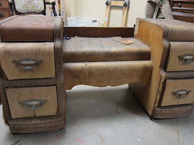 The picture above is where we stopped working. Then, Julie stopped by! Julie is one of my new fabulous furniture suppliers! She is helping me keep the store stocked with new furniture and I asked her if she was interested in tackling this project. Her husband is also a very talented wood worker and was able to rebuild the sides of the vanity and a new tray table with scalloped edges, matching the original lines of the piece.