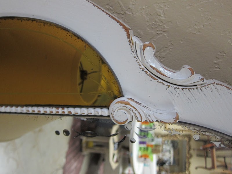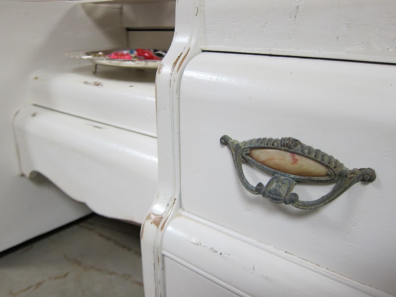 I wanted to leave the dings to show the age and wear and intent about keeping the vanity white so that the beautiful details on the mirror and in the woodwork would not get lost in the finish. I also wanted the original and beautifully tarnished hardware to pop!