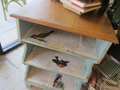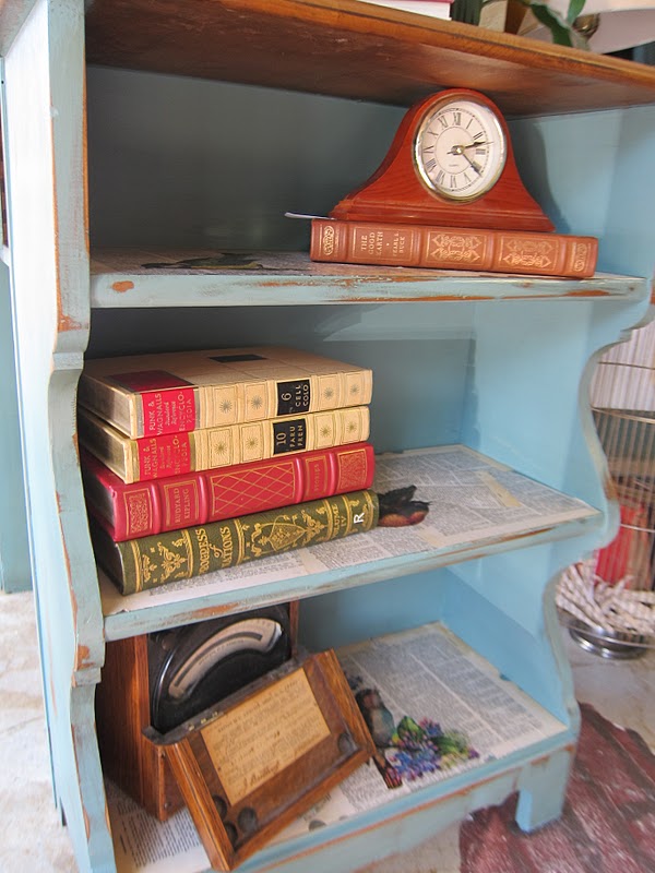 I painted the bookshelf and added the same bird images that are on the knobs on each shelf.