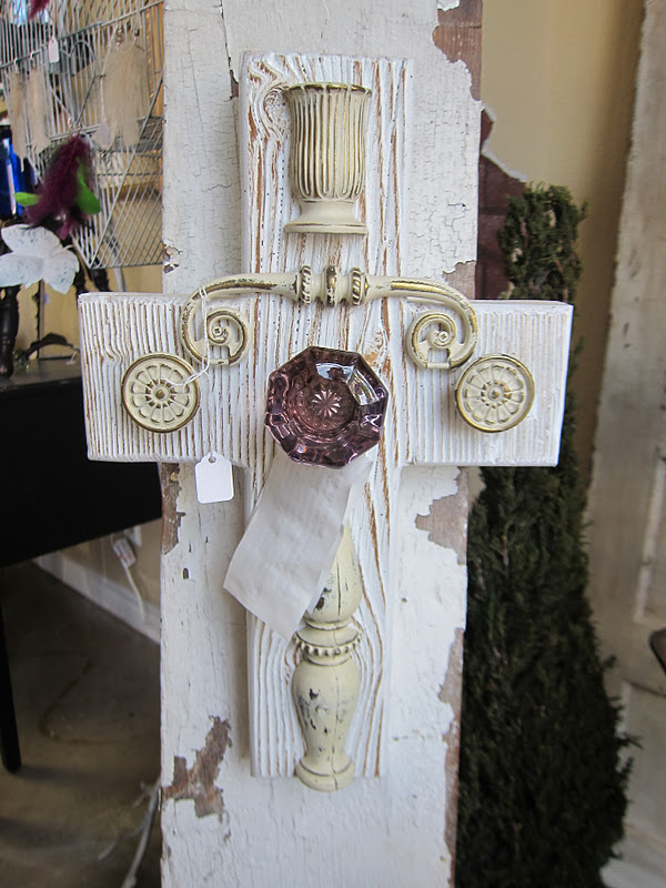 This heart shaped birdhouse hangs on a floor stand and is perfect for hanging the trendy feather earrings. In its original state, this birdhouse was green and brown with a huge bouquet of fake flowers on the top. I took those off and sprayed it white and added some distressing so that appeared more aged than it actually is.