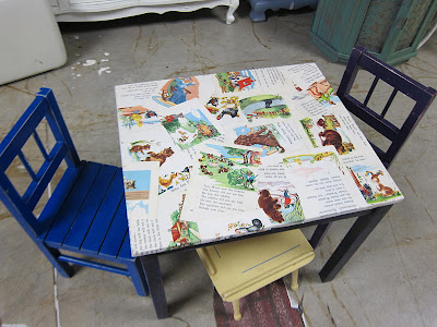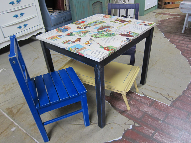Small children’s table with chairs. The top of the table is decopauged with vintage pages from a California Textbook from 1964. School seems more fun back then based on these pictures!