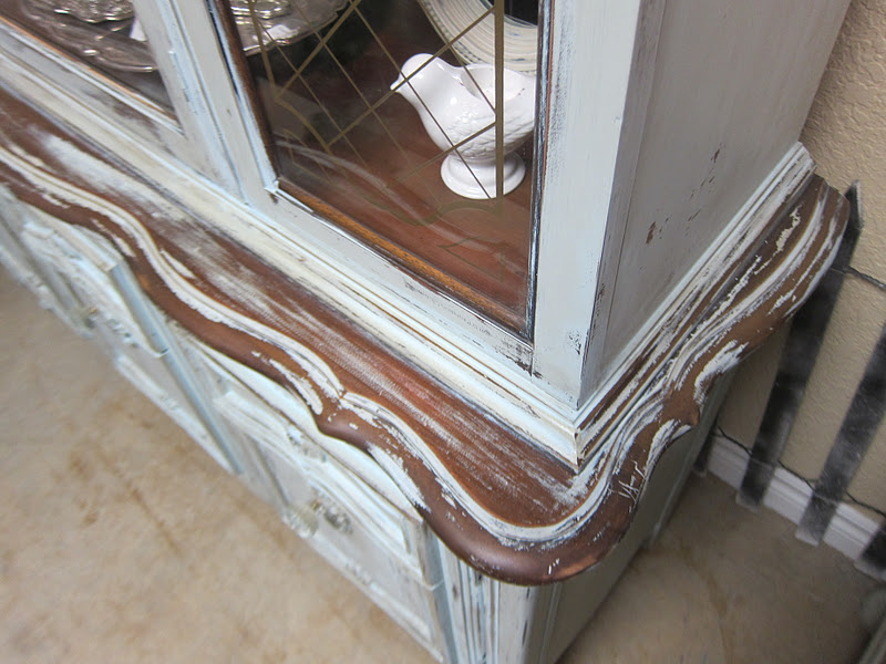My first problem was that I ran out of paint. My objective was to match this hutch to a chippy dining set that I had already painted and I used a light grey as the base color and then mixed a bit of teal to give a subtle hint of blue. I mixed my own chalk paint, but the grey I had left was leftovers of a homemade batch which doesn’t keep well. So, the batch for this piece was super chalky and didn’t go on as smoothly.