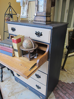 A faux drawer reveals none other than a traditional secretary! Strong enough to stash a small lap top or tablet with hidden storage for “officey” things.