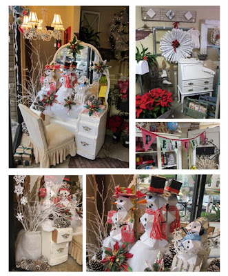 We are completely transformed and bursting with Christmas joy. Can you believe that we decorated this store with nothing more than $10 worth of yard sale Christmas decorations, piles of old books and music, a tree that was curbside way back in July and left over scrapbook paper…oh, and a lot of time!