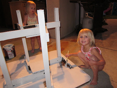 I let both my girls help with this one. After all, it couldn’t get much worse. We painted this table in its entirety with a light grey color…a homemade chalk paint blend.