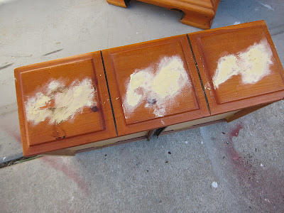 I didn’t like the heavy look of three handles on the top drawer and wanted to coordinate the knobs on the desk with the knobs on the nightstand, so I filled all the holes for new knobs…no handles.