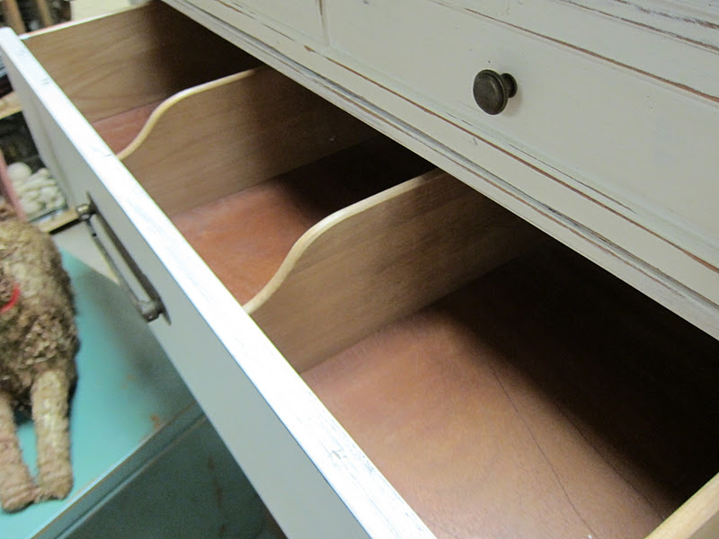 By far, the most well built and nicest dresser I’ve ever re-done! Dividers in the top two drawers with solid wood bases in each drawer and solid wood dividers between each drawer. This is HEAVY!