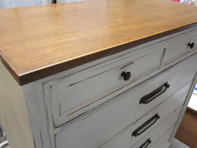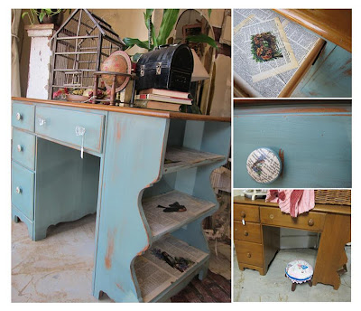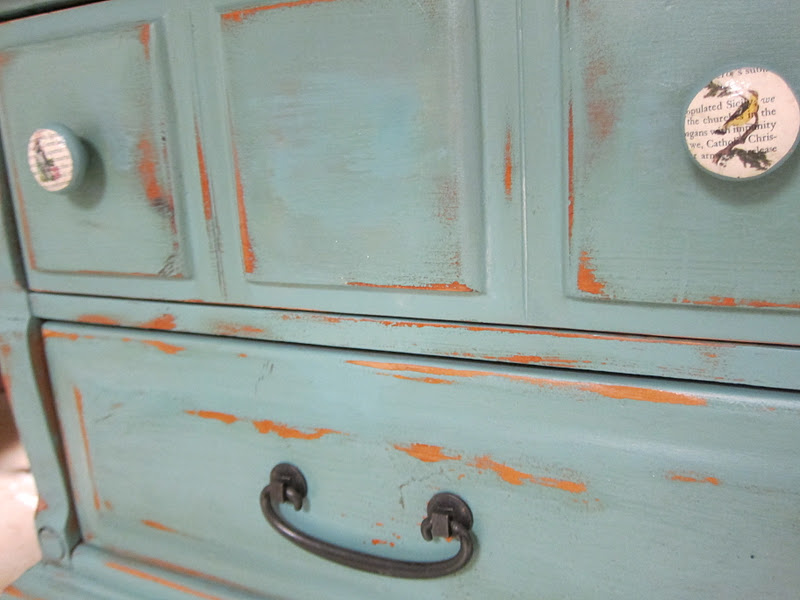 Matching knobs with birds printed on book pages and a new handle that wasn’t so chunky. Heavier distressing on the blue nightstand to match the heavier distressing on the desk.