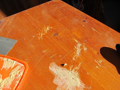 The top of the nightstand was a horrendous mess. Huge gauges out of the wood and scratches that were too deep to sand out. Plus, it was a knotty pine which (in my opinion) wasn’t a good contrast with the very simple wood top of the desk. So, I filled all of the gauges and scratches with wood filler and sanded the entire top down.