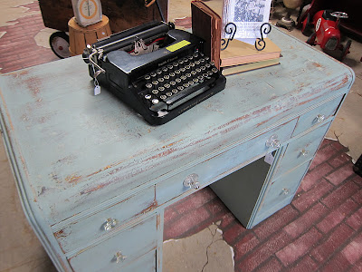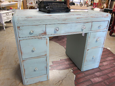 How gnarly is this desk? There was old paint spilled down the front. Over a dozen drill holes in the top of it not to mention the patches of water marks. And, it was love at first sight. OK…that is a bit of an overstatement. I was drawn to the retro style hardware on it and thought this piece lent itself to a heavy distressing all over it. Plus, it really reminded me of one of my favorite refinished pieces, this vanity that I had when the store first opened.