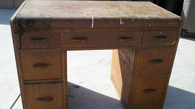The desk had the same issues that this vanity had. Lifting veneer, gauges in the wood all over. It was just plain unsightly. But, I made this vanity look pretty cool so I thought I could do the same with the desk.