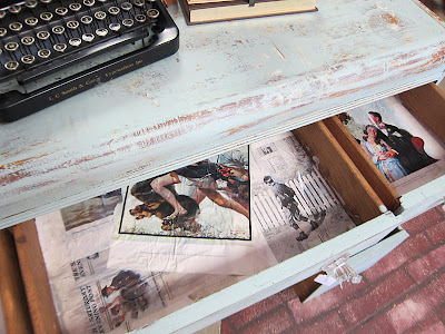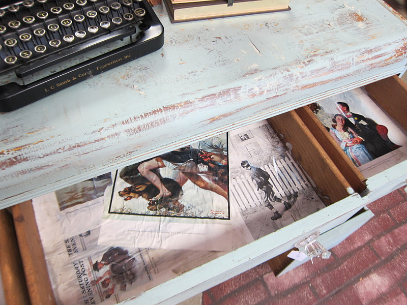 I love the variety of images that draw on the blue color in the desk and keep with the vintage motif!