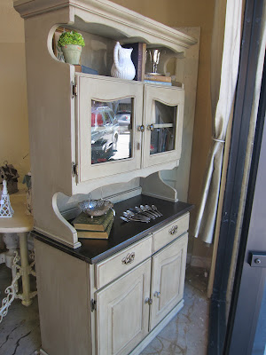 This is a fabulous hutch with a butcher block top that has be re-stained with dark walnut. The top and base are painted in a taupey beigey grayish color with a dark walnut glaze there are new crystal knobs. Stay tuned for the process pictures of this piece. I will leave you with the teaser that it was originally orange, yellow, green and purple with a painted rose on the side. I’m not kidding. It was horrific.