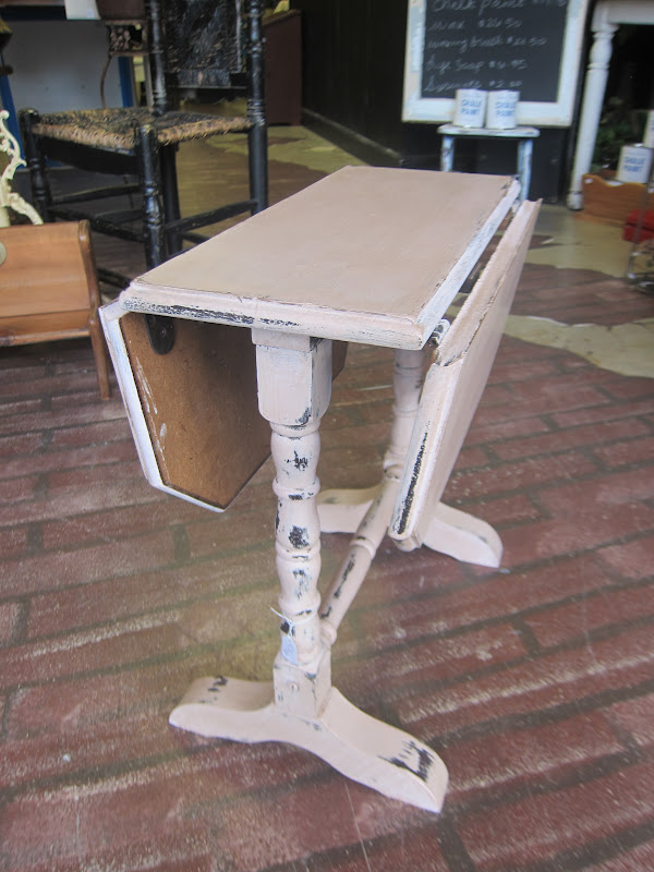 Small drop leaf side table painted in Antoinette and distressed with dark wax. 100% of the sale from this piece go to benefit the Samantha Rivard college account because she painted it! It just goes to show that Annie Sloan Chalk Paint is easy enough for even a 4-year old to use.
