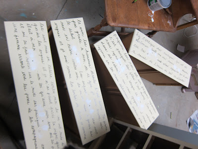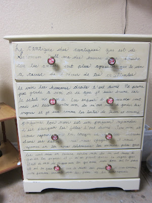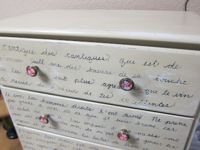 Then, I free handed a beautiful love song on all of the drawers in French. It is versus 1-4 from the Song of Songs (along with a number of typos and duplicate words).