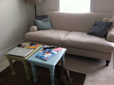 Now, these side tables, put together, with one refinished and one in original found form have been good to us. I got them at the Rose Bowl Swap meet for $25 for the pair years ago. But, they just weren’t working as a coffee table combo.