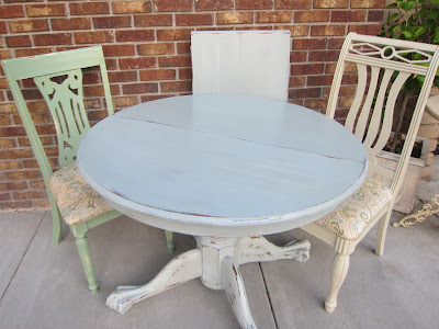 Recognize this table? It had a dark wood top and painted base. Customer asked if I could match the paint on the base for the top so a 50/50 mix of Paris Grey and Duck Egg did the trick.