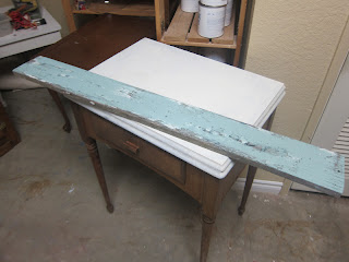 I added a coat of Provence to the piece of wood and then heavily distressed it so that the blue washed right off and just peeked through the unfinished wood and old white paint.