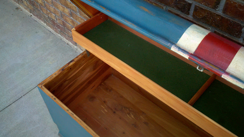 I taped off the red for the white stripes and added a red stripe to the front to carry the pattern onto the front of the cedar chest.