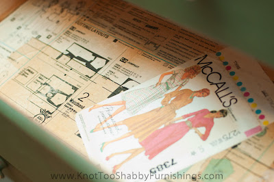 The knobs have images from vintage sewing patterns decopauged on them with a coat of dark wax. The insides of the drawers are lined with the same vintage patterns to add a fun, visual interest that coordinates with the knobs!