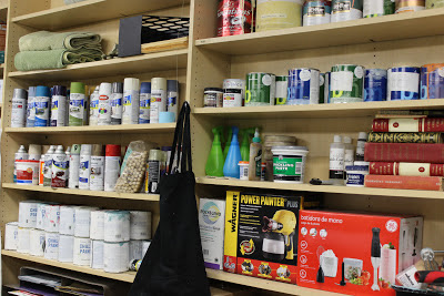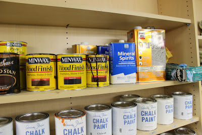 Lots of latex junk paint for misc. painting projects that don’t require chalk paint. A paint sprayer for big jobs, an electric mixer that we use to mix milk paint, lots of Rustoleum spray paint for small jobs and empty paint cans. Tons of empty paint cans. I never ditch them!