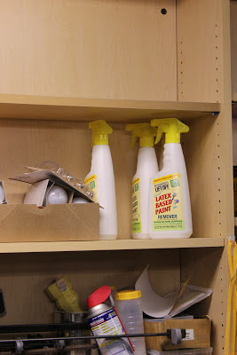 I always keep a large container of Klean-strip on hand for stripping and staining wood. Plus, several cans of mineral spirits that I use to make wax glazes and wood stain in Dark Walnut and other rich colors. And, if I’m feeling in the mood to protect my skin, I have latex gloves on hand (ha ha…”on hand”…nice play on words).