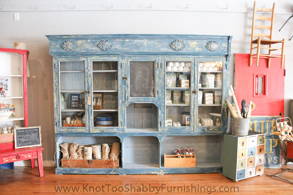 First, I needed a more permanent and prominent display piece for Annie Sloan Chalk Paint and Miss Mustard Seed’s Milk Paint. I found this antique, turn of the century cabinet right here in Glendora on craigslist. I went to check it out on a Sunday night and was practically begging the guy to drop the price just a little. He was asking $600 and I was really hoping to get it for around $450/$500. But, he wouldn’t budge an inch on the price. I went home and slept on it. Showed pictures of it to a few people. Talked about it with my go-to business associates and finally decided I couldn’t live without it despite the price. I had to invest another $100 in a delivery service because at nine and a half feet long and over seven feet tall, this was way out of my lifting and carrying capabilities.