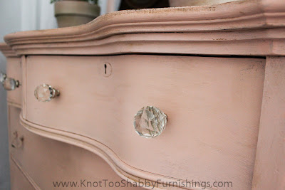 I kept the handles on the bottom drawers but added new diamond cut crystal glass knobs on the top ones.
