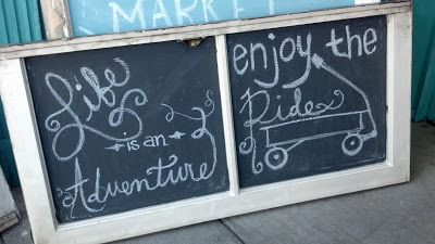 About half a dozen window pane chalkboards painted in various shades of blues, reds and browns!