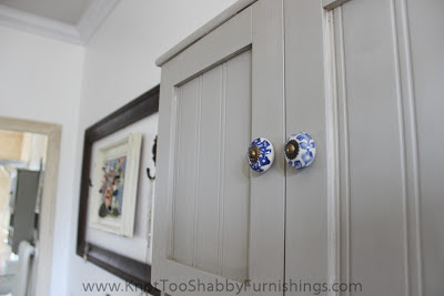 The cabinet above the toilet got a fresh coat of paint to match the other cabinets and some new knobs to tie in the splashes of blue.