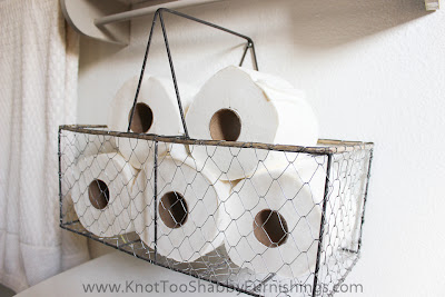 I re-used the chicken wire basket and hung it above the toilet for extra TP.