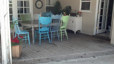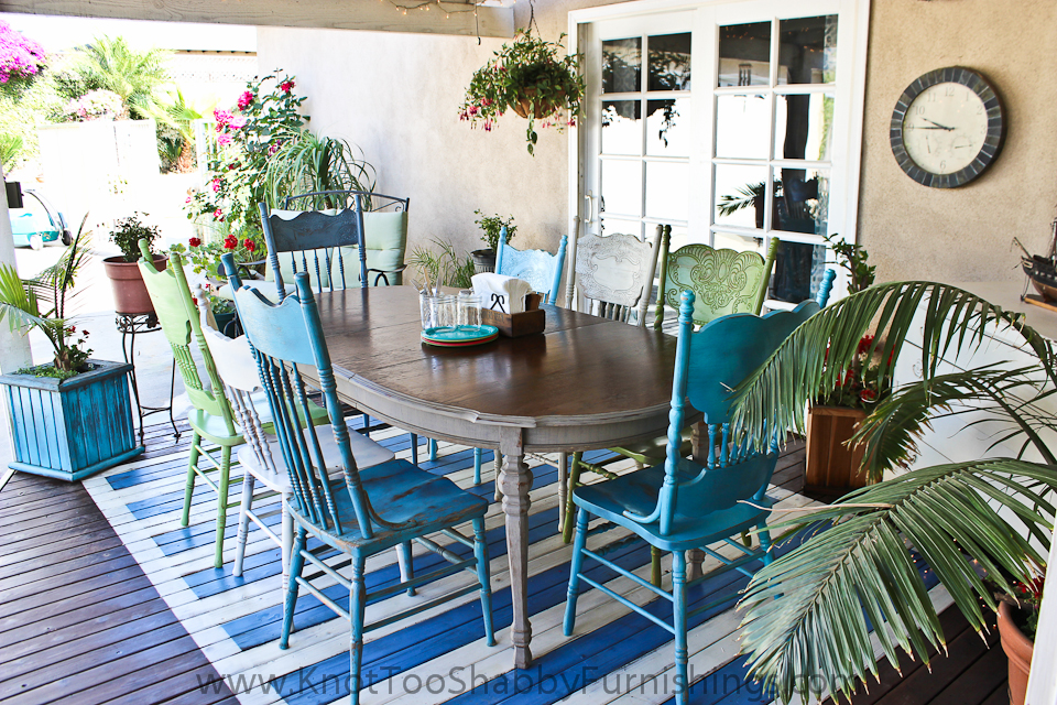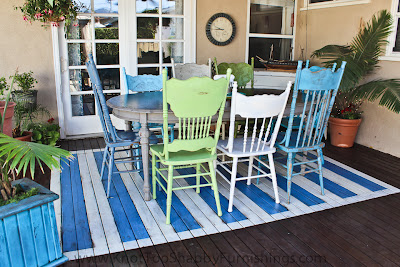 It took me about six months to find the different chairs and each one is spray painted in a different shade of blue, white or green.