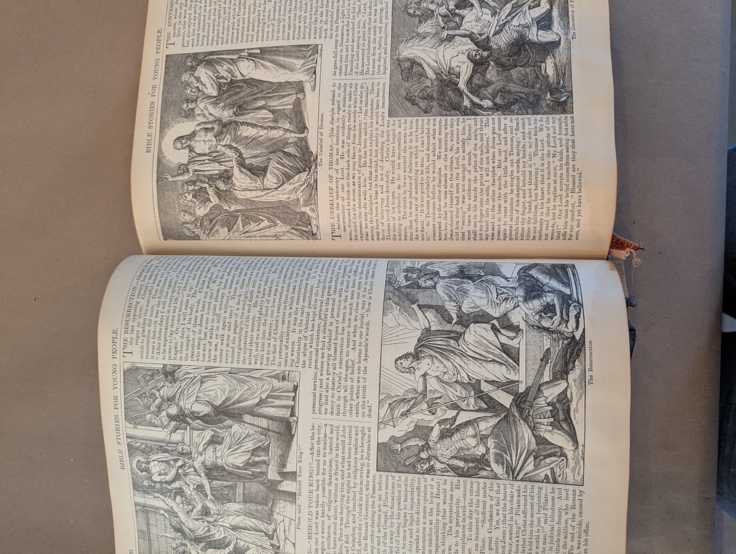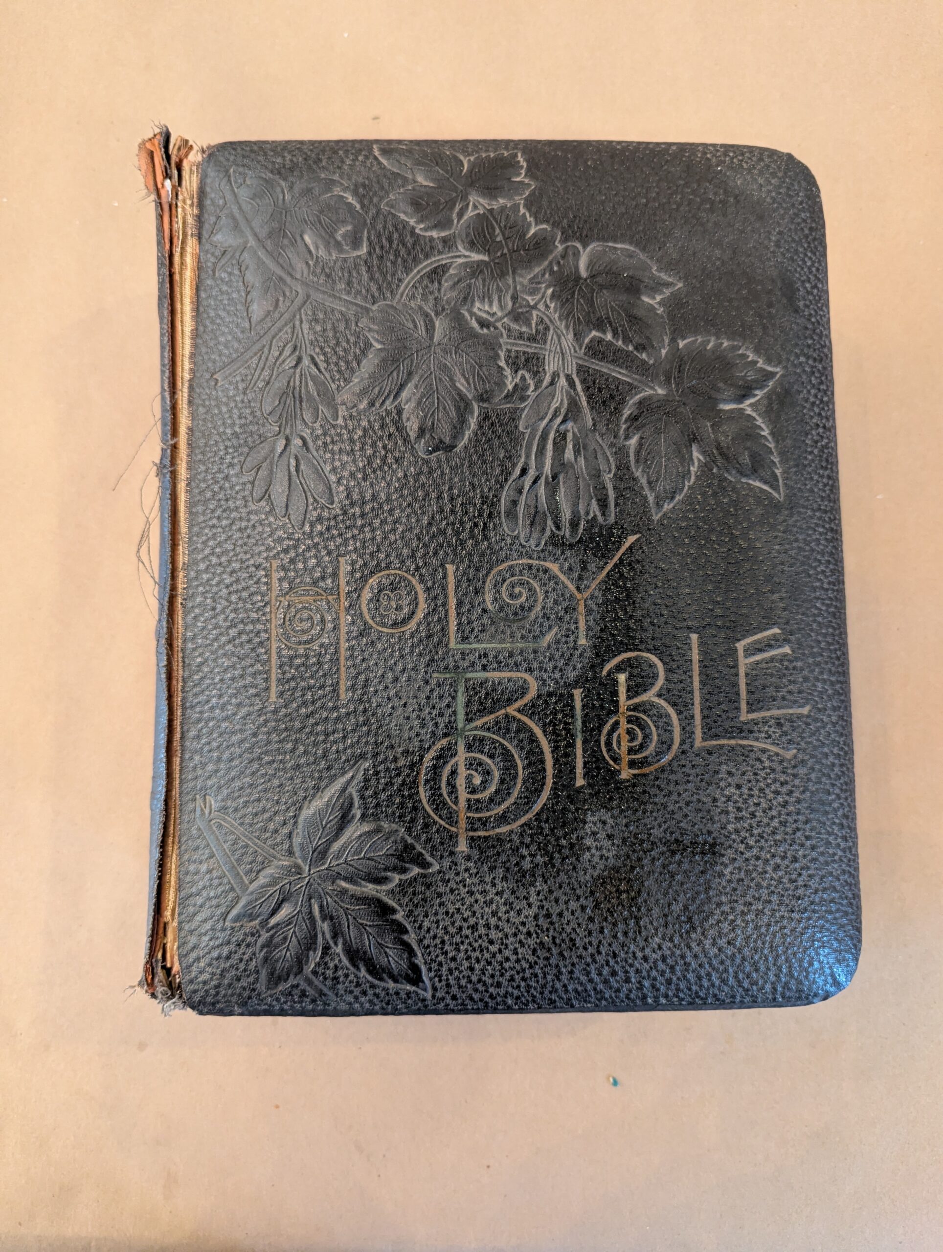 To the best of my research, I believe this antique Holy Bible is copyright 1891. This is a beautiful, aged book complete with vintage patina. Beautiful details adorn the front cover and spine in black leaves and branches. The cover is a dark brown, but you can see in the photos some fading on the back cover and spine, possibly due to sun and light exposure or general wear. The pages are gold gilded with signs of water stains and other wear. Definitely a book to add to ones collection of antique classics. The inside cover is filled with family inscriptions from as far back as 1891. The binding is slightly detached on the top. The Bible is extremely heavy and should be read or displayed with great care as to avoid further damage to the binding.