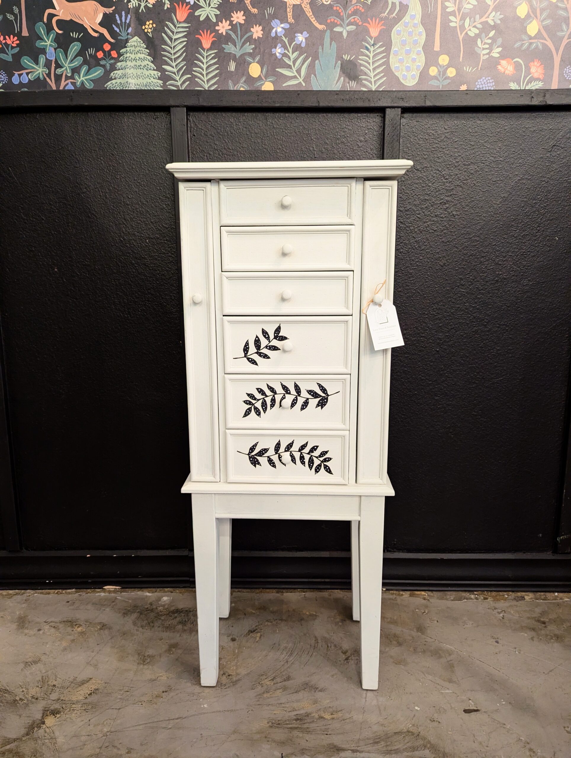 In pristine condition with beautiful black felt lined drawers. Painted by Susanne from Lazy Days & Sundays in Annie Sloan Old White with Redesign by Prima Design Transfers adding a unique, decorative element.