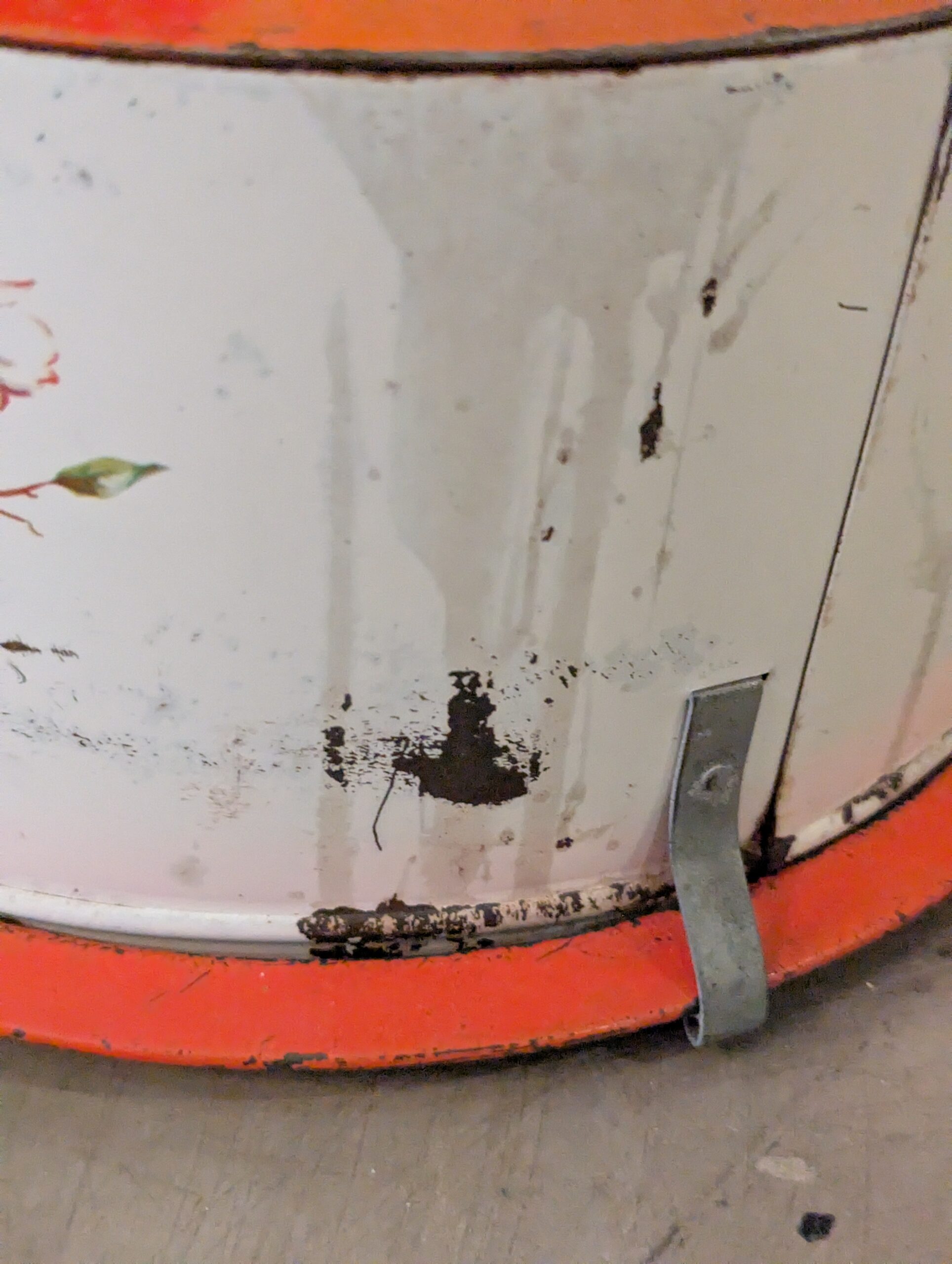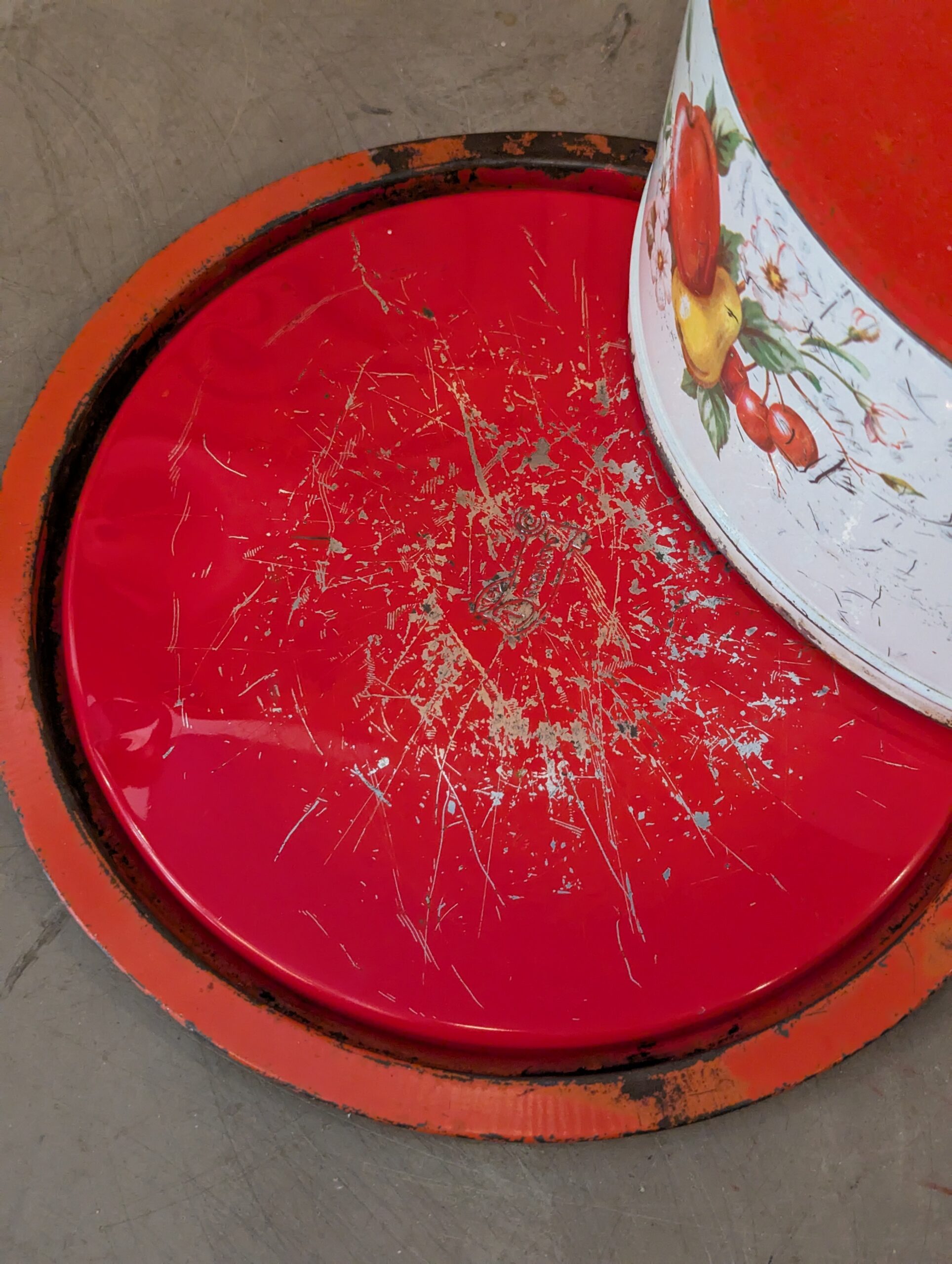 This vintage, metal cake carrier is a 1950’s style decoware piece . Features a distinctive fruit and floral pattern with a contrasting lid that clips into place.